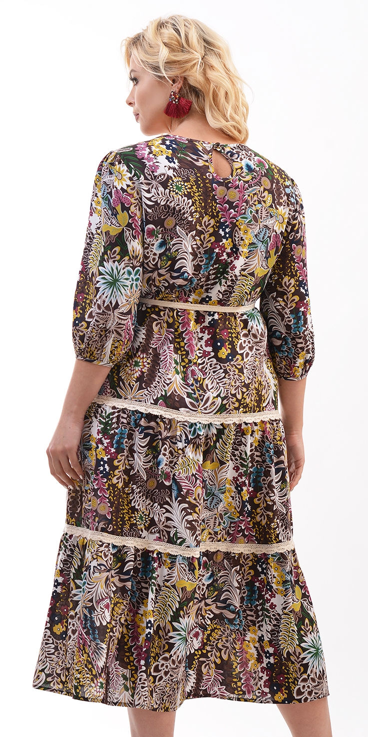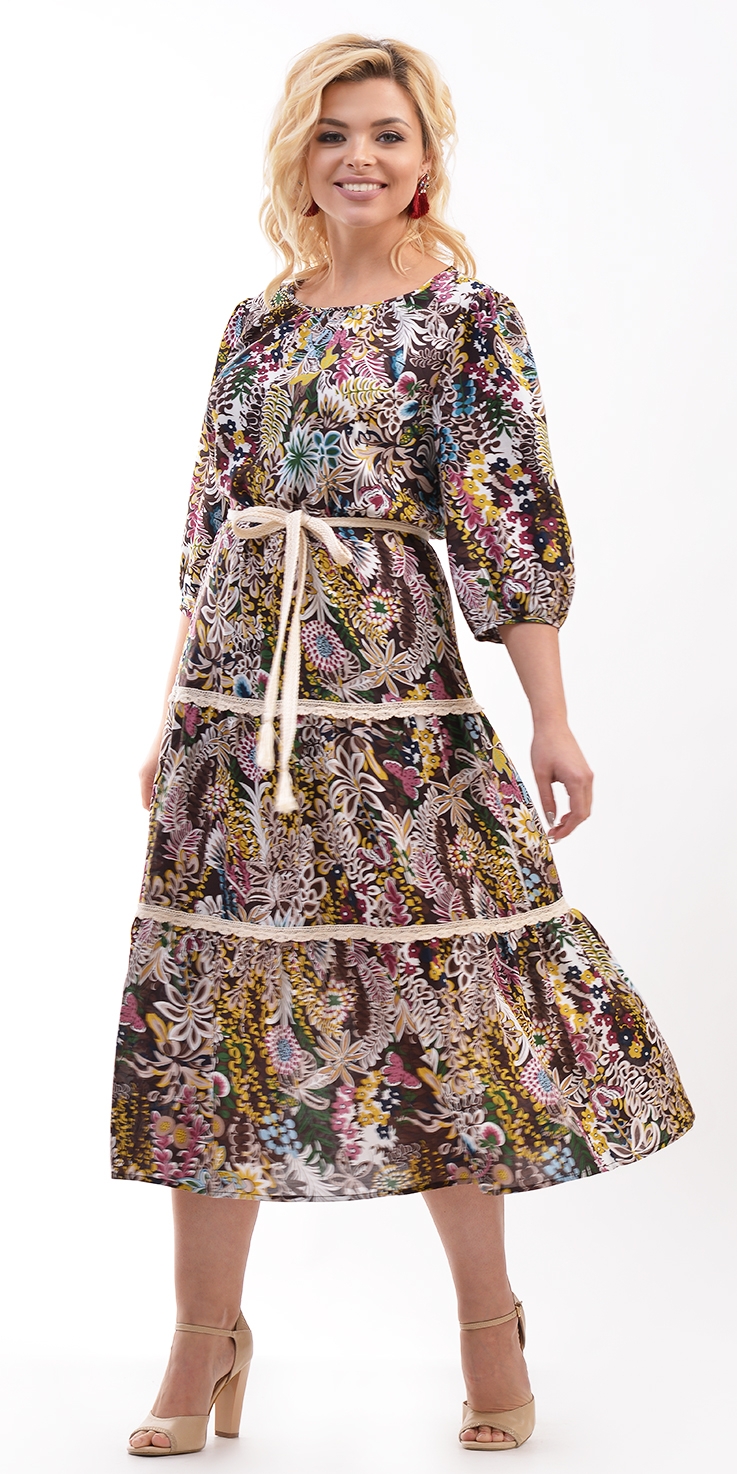 Легкое платье А-силуэта из штапеля с цветочным принтом. Вырез горловины округлой формы. Рукав длиной 3/4 со сборкой по окату и низу рукава. Юбка ярусная с отделкой тесьмой. На спинке «капелька» и застежка на пуговицу. Пояс в комплекте.