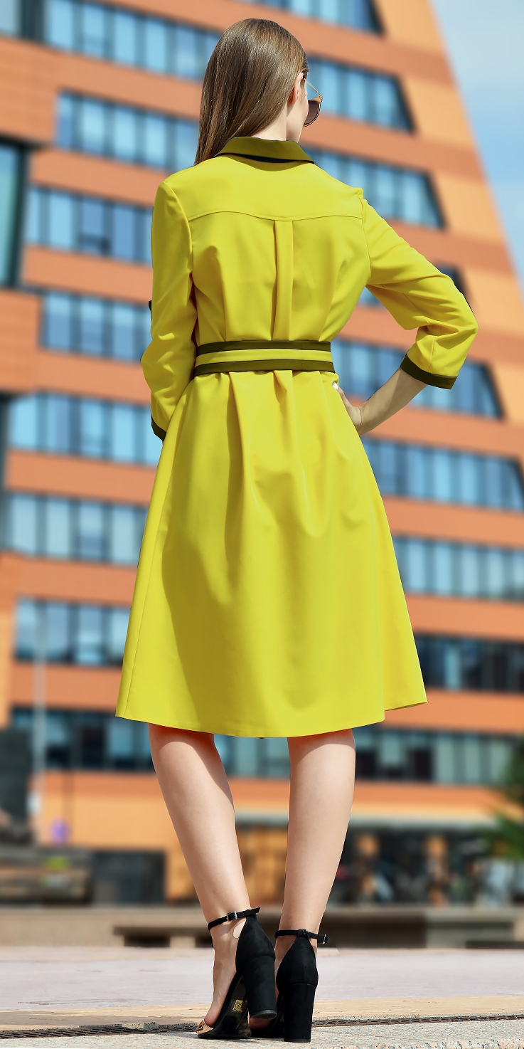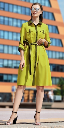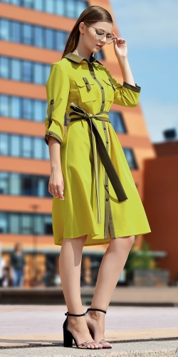 Платье-рубашка А-силуэта из костюмной ткани с контрастной отделкой. Воротник рубашечного типа, рукав