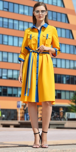 показать все описаниеПлатье-рубашка А-силуэта из костюмной ткани с контрастной отделкой. Воротник рубашечного типа, рукав длиной 3/4 с патой. По переду накладные карманы, на спинке фигурная кокетка. Застежка по планке на пуговицы.