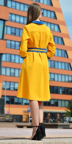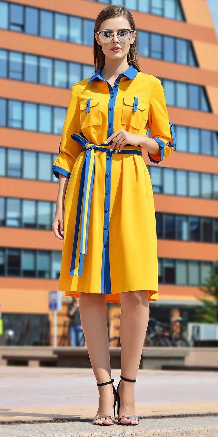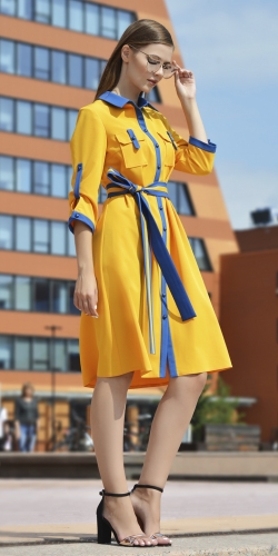 Платье-рубашка А-силуэта из костюмной ткани с контрастной отделкой. Воротник рубашечного типа, рукав