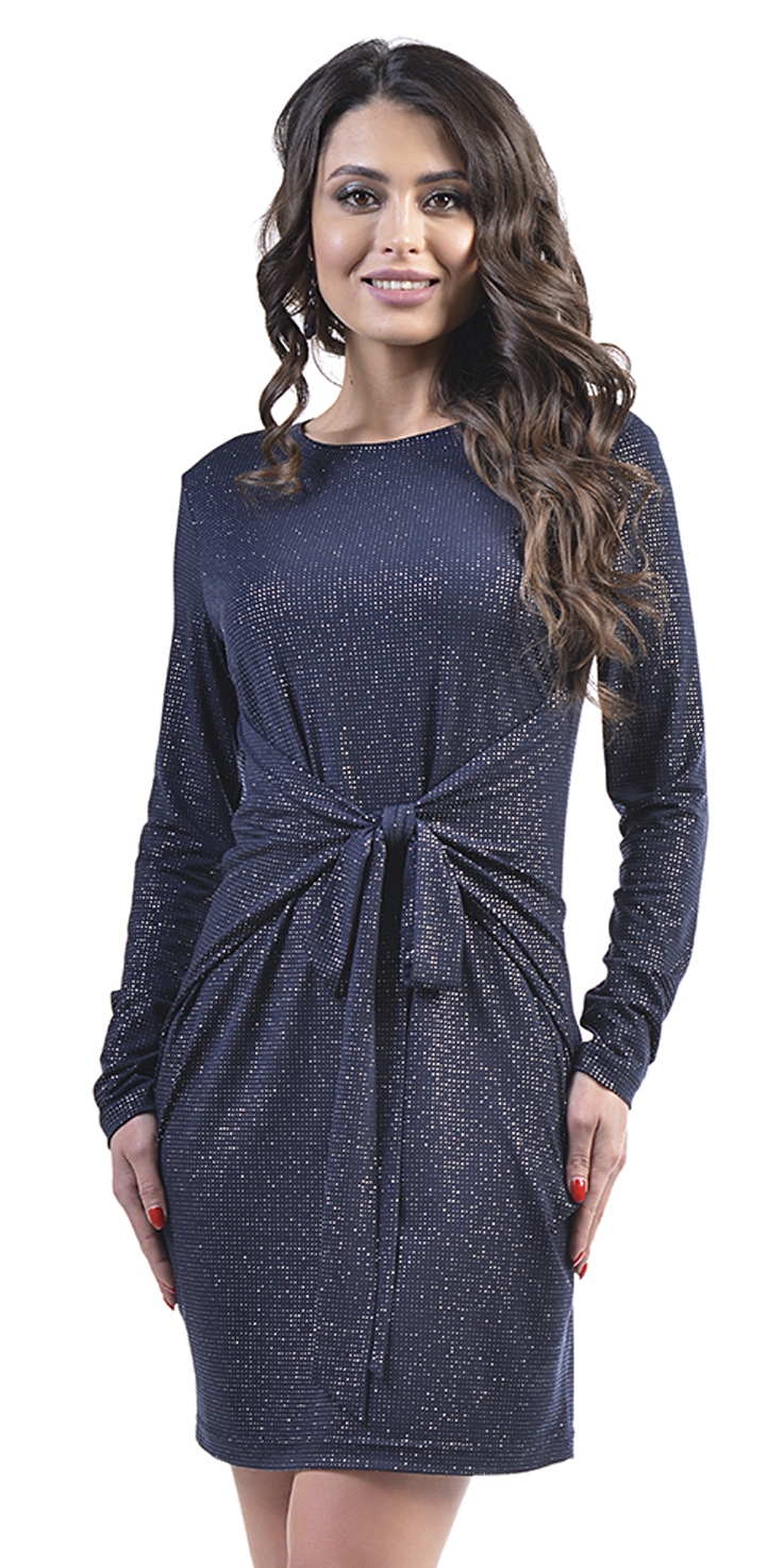 Эффектное платье с круглым вырезом и длинными рукавами из блестящего трикотажа. Широкий пояс на талии подчеркивает фигуру.