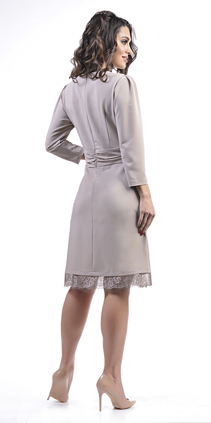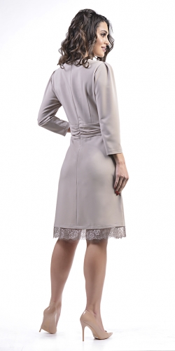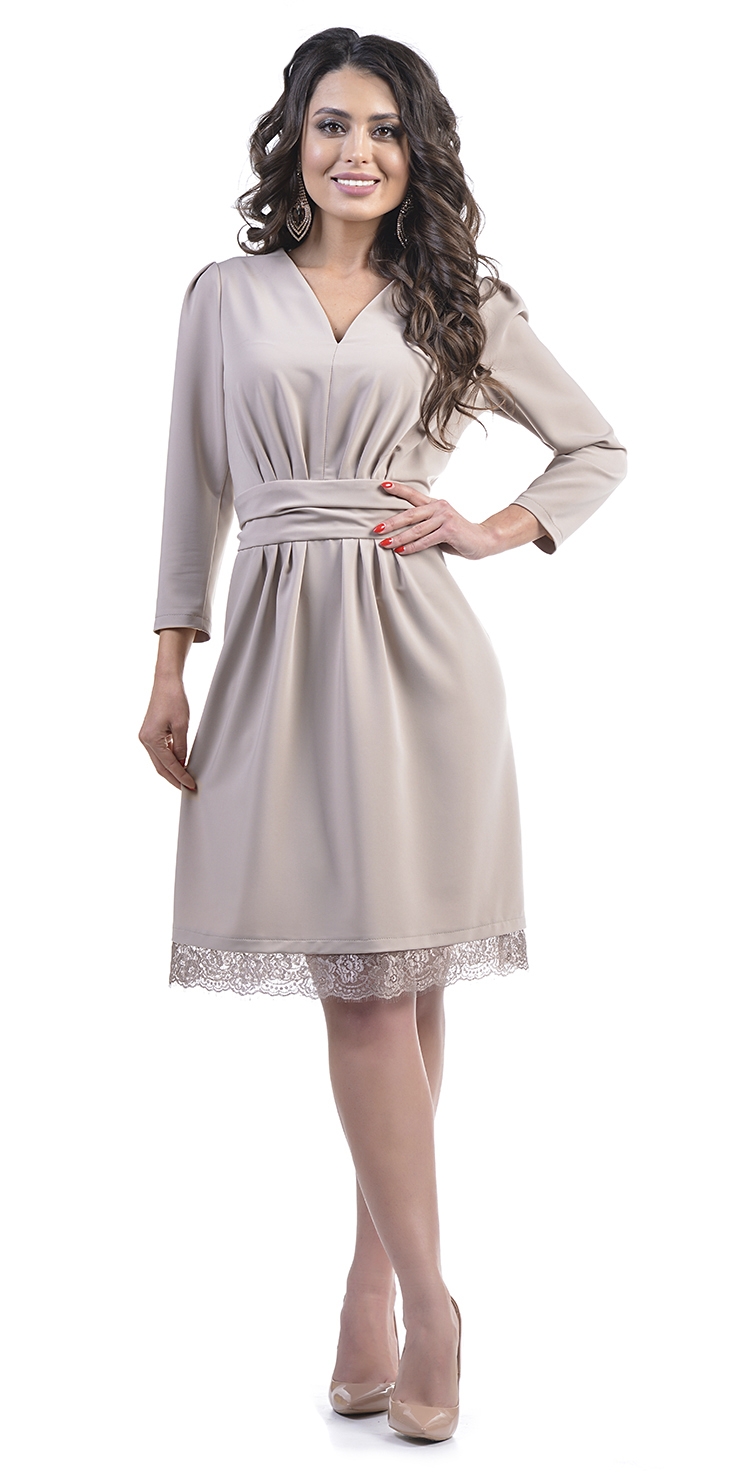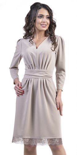 показать все описаниеНарядное платье с фигурным вырезом, мягкими складками, широким драпированным поясом, кружевной отделкой и рукавами 3/4.