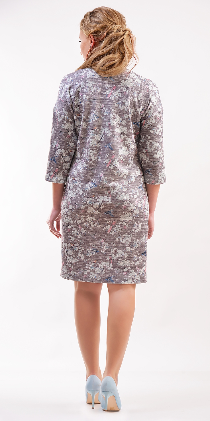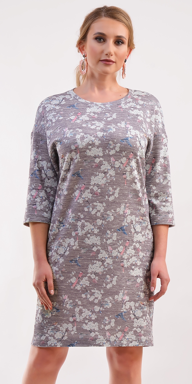 Комфортное платье прямого силуэта из мягкого принтованного трикотажа. Вырез горловины округлой формы, плечо спущенное, рукав длиной 3/4. Без застежки.