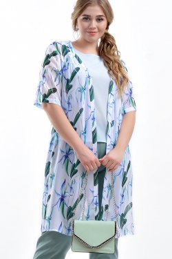 Длинная рубашка из шифона с интересным летним принтом. V-образный вырез горловины, короткие рукава и