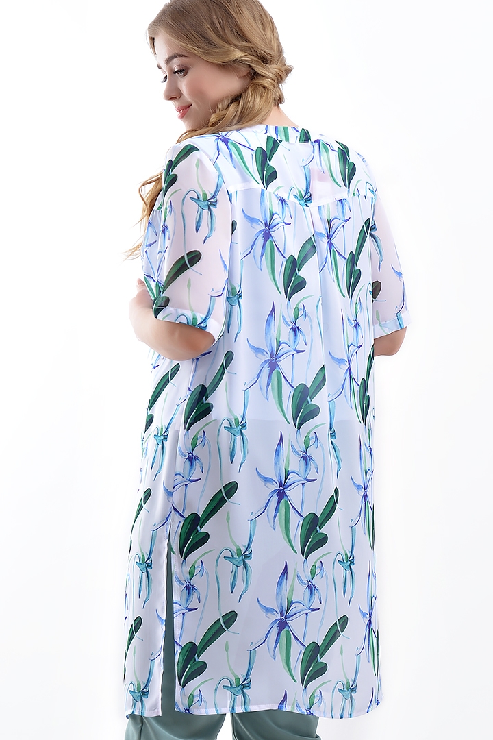Длинная рубашка из шифона с интересным летним принтом. V-образный вырез горловины, короткие рукава и высокие разрезы по бокам. По переду планка, по спинке кокетка и встречная складка.