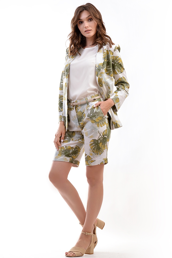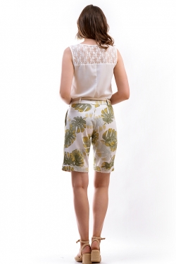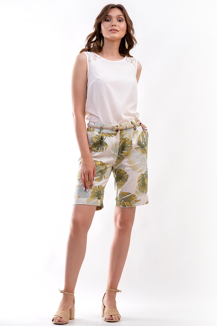 Шорты-бермуды из льна с модным принтом. Шорты на широком поясе (5 см) с шлевками, с высокой посадкой. По бокам карманы. Застежка по переду на молнию и пуговицы.