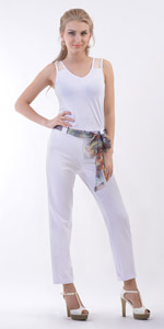 Летний топ со спущенной линией плеча из трикотажа. Вырез горловины – «лодочка». На переде интересный принт. Низ изделия посажен на широкий пояс. Без застежки.
