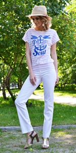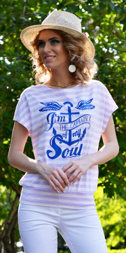 Летний топ со спущенной линией плеча из трикотажа. Вырез горловины – «лодочка». На переде интересный принт. Низ изделия посажен на широкий пояс. Без застежки.