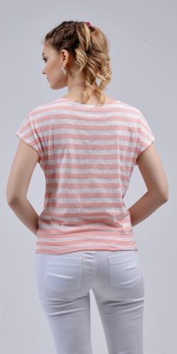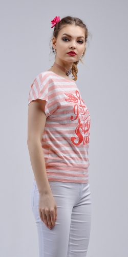 Летний топ со спущенной линией плеча из трикотажа. Вырез горловины – «лодочка». На переде интересный принт. Низ изделия посажен на широкий пояс. Без застежки.