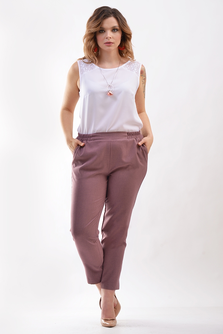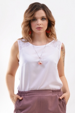 Топ из тонкой креповой ткани с круглым вырезом горловины и кружевными кокетками по переду и спинке. На спинке средний шов, в боковых швах разрезы.