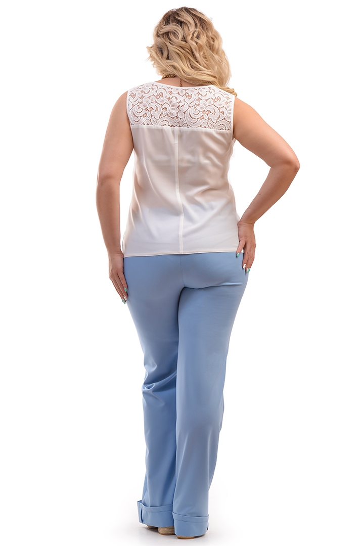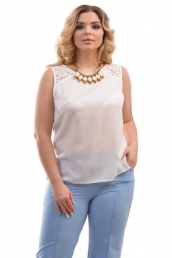 Топ из тонкой креповой ткани с круглым вырезом горловины и кружевными кокетками по переду и спинке. На спинке средний шов, в боковых швах разрезы.
