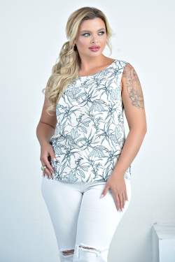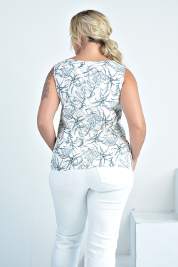 Легкий летний топ на широких лямках из вискозной ткани. Вырез горловины круглый. Силуэт полуприлегающий. По боковым швам небольшие разрезы. По спинке средний шов с декоративным разрезом и пуговкой.