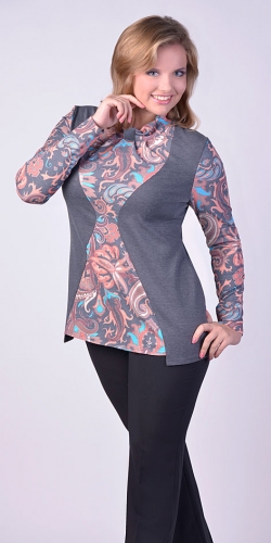 Туника с визуальным эффектом водолазки поверх которой надета однотонная жилетка. Свободный крой туники позволяет чувствовать себя комфортной в любой обстановке. Воротник с перемычкой не сковывает движения. Модель с вертикальными линиями по переду делает фигуру стройнее.