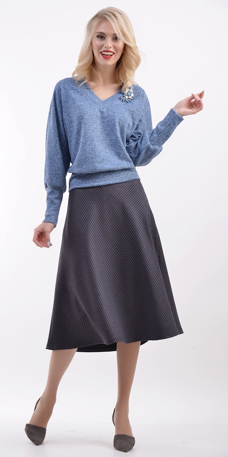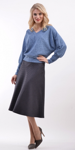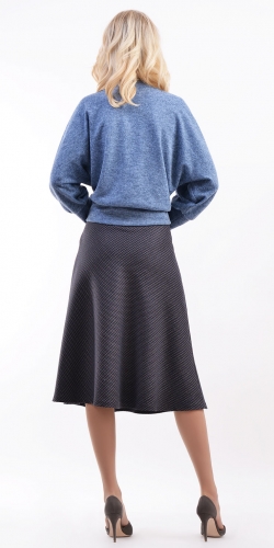 Юбка силуэта-колокол из костюмной ткани жаккардового переплетения, длиной ниже колен. Застежка сбоку на молнию и пуговицу.