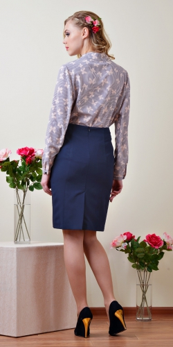 Прямая юбка на подкладе, с рельефными швами и подрезами. В средней части переда вшит декоративный эл