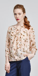 Блузка из крепа полуприлегающего силуэта. Воротник рубашечного типа. Рукав короткий с «капелькой», на узком манжете. По спинке кокетка. Застежка по планке на пуговицы.