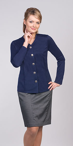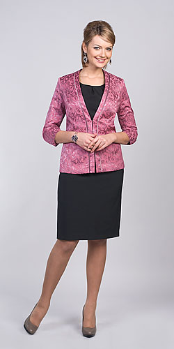 Нарядная блузка из трикотажного полотна на подкладке. Горловина округлой формы. Рукав до середины предплечья. Низ изделия украшен фестонами. На спинке небольшой разрез с застежкой на пуговицу.