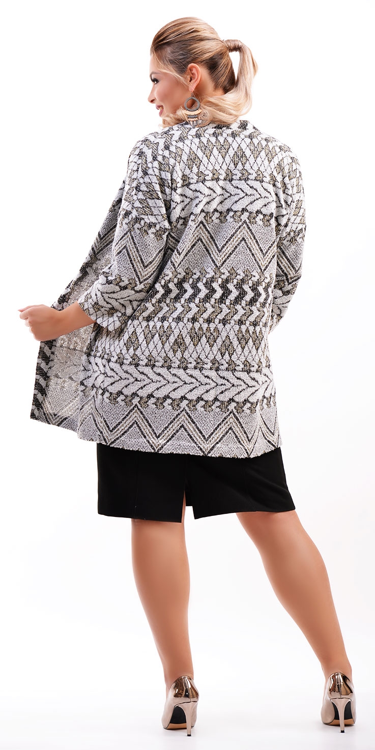Кардиган из трикотажа прямого силуэта, длиной до середины бедер и рукавами 3/4. Борта переда оформлены планками. Без застежки.