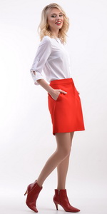 Юбка из костюмной ткани на подкладке длиной чуть ниже колен, слегка заужена. По переду и спинке рель