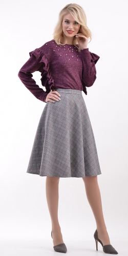 Джемпер из трикотажа прилегающего силуэта с круглым вырезом горловины, длинными рукавами, вертикальными воланами и разрезами по переду. Перед джемпера расшит жемчужными бусинами