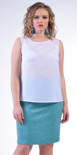Топ из тонкой креповой ткани с круглым вырезом горловины и кружевными кокетками по переду и спинке. На спинке средний шов, в боковых швах разрезы.