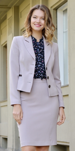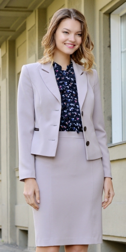 Зауженная юбка из костюмной ткани с отделкой из кожи. Юбка на поясе, по переду и спинке рельефные швы. По спинке шлица и застежка на потайную молнию.